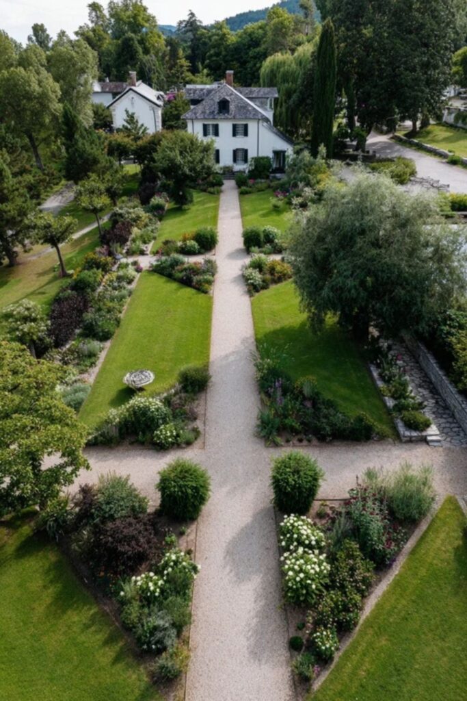 Early morning light falls across a row of white oak raised beds where lettuce is already six inches tall. Beyond the vegetable garden, a long …