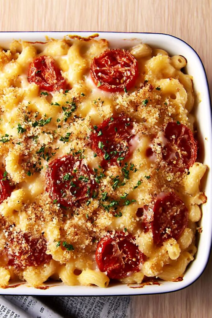 - Top and Bake: In a small bowl, mix the panko with 2 tablespoons of melted butter and the remaining 1/4 cup of each cheese. Arrange the broiled tomato slices on top of the pasta, then sprinkle the panko mixture over everything. Bake for about 30 minutes, until the topping is golden brown and the sauce is bubbly.