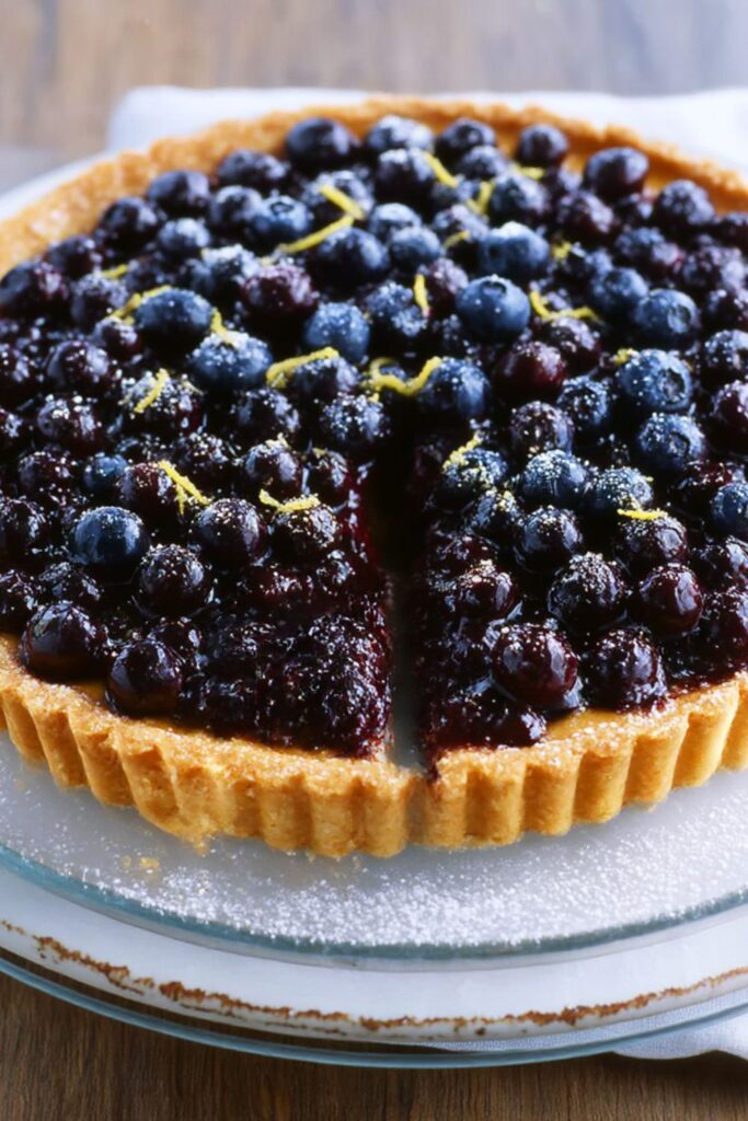 A beautiful and delicious tart with a crisp, buttery shortbread crust and a sweet, vibrant fresh blueberry filling.