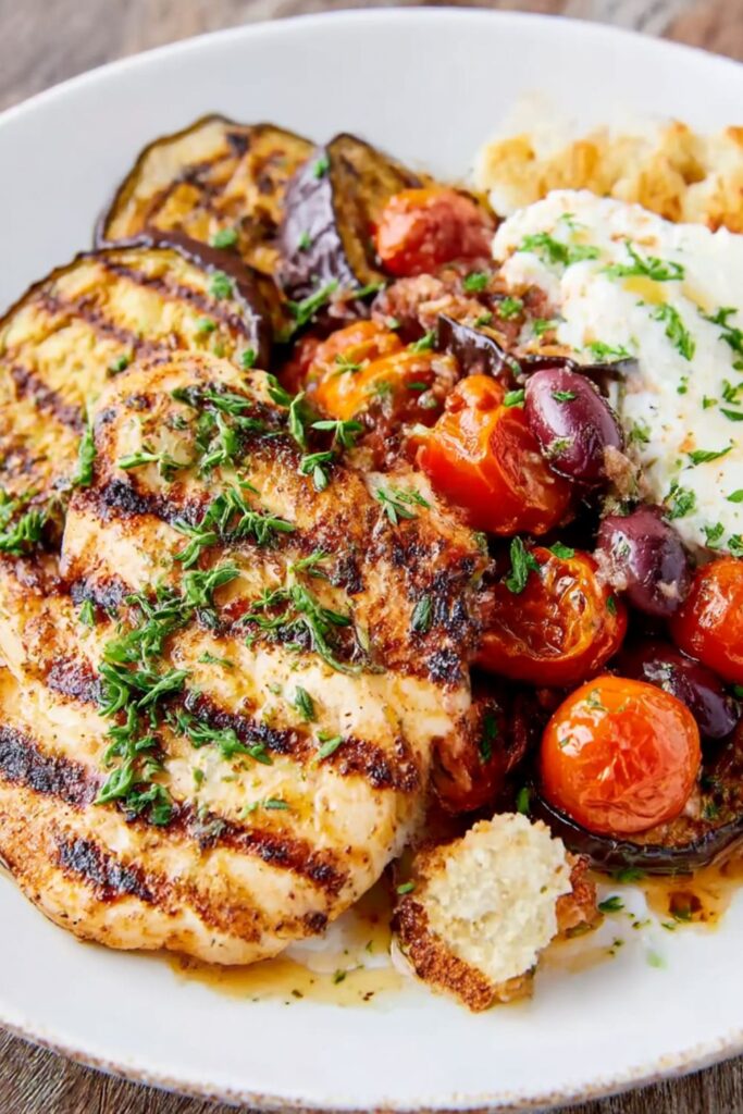 - Assemble and Serve: Arrange the grilled chicken, softened eggplant, sliced tomatoes, and fresh mozzarella on a large platter or on individual plates. Drizzle the olive and herb mixture over everything, sprinkle with a few more fresh herbs, and finish with another light drizzle of olive oil. Serve immediately with grilled rustic bread.