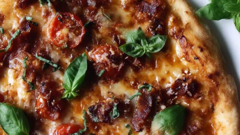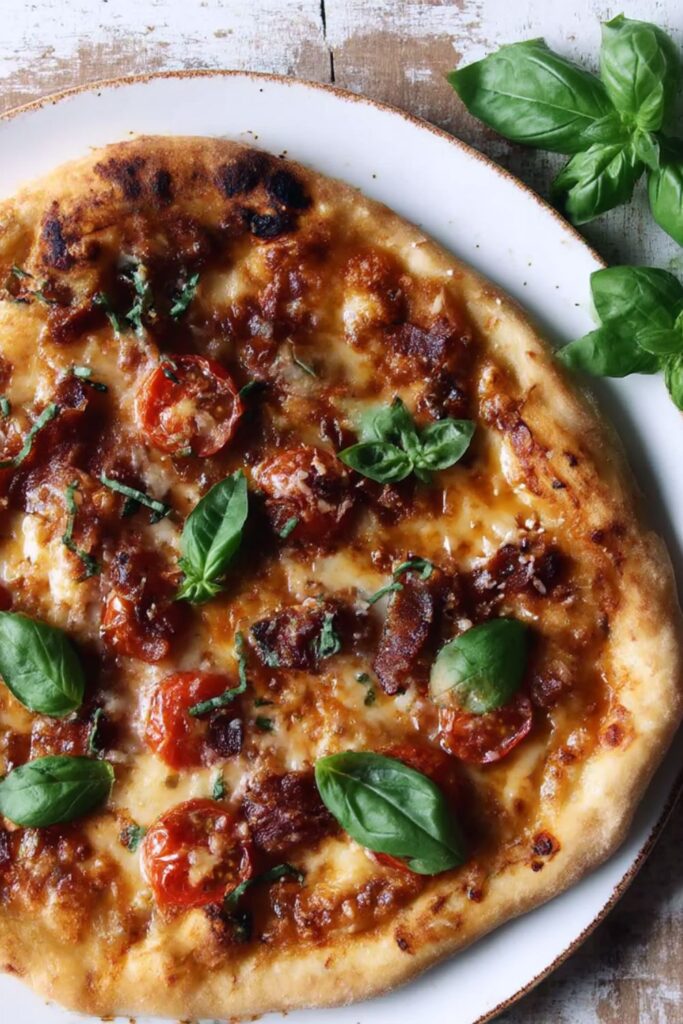 An artisanal, restaurant-quality pizza featuring fresh heirloom tomatoes, salty Pecorino Pepato cheese, and rich guanciale on a perfectly crisp, golden-brown crust.