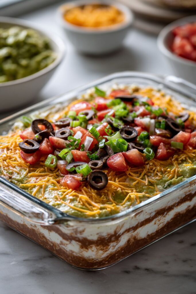 - Add Fresh Layers: Sprinkle the freshly grated cheddar cheese evenly over the guacamole. Top with the seeded diced tomatoes, sliced black olives, and green onions.