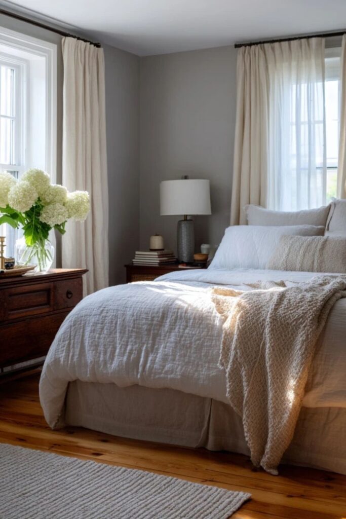 Every Martha bedroom starts with the walls. Her signature Bedford Gray, a warm gray with brown undertones, makes the whole room feel like a cashmere blanket. It reads neutral without turning cold or sterile.