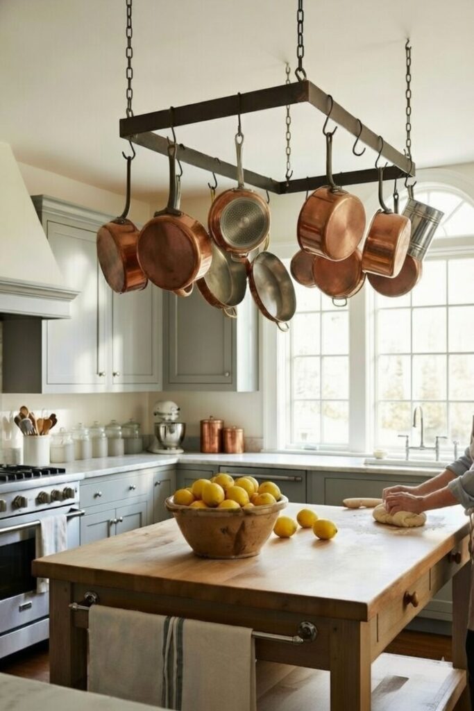 Copper is the jewelry of the working kitchen, but it must earn its keep. Hang heavy copper saucepans and skillets from a pot rack or a simple brass rail within arm’s reach of the stove.