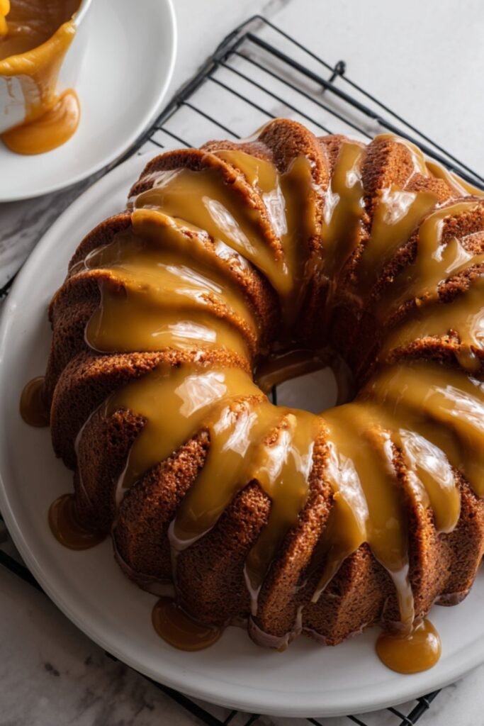 - Cool and serve: Cool slightly on a wire rack. Invert onto the rack and cool completely. Drizzle with caramel sauce before serving.