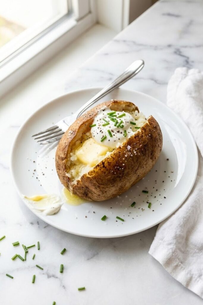 - Finish and serve: Cut open each potato, season with salt and pepper, and top with butter, sour cream, and chives.