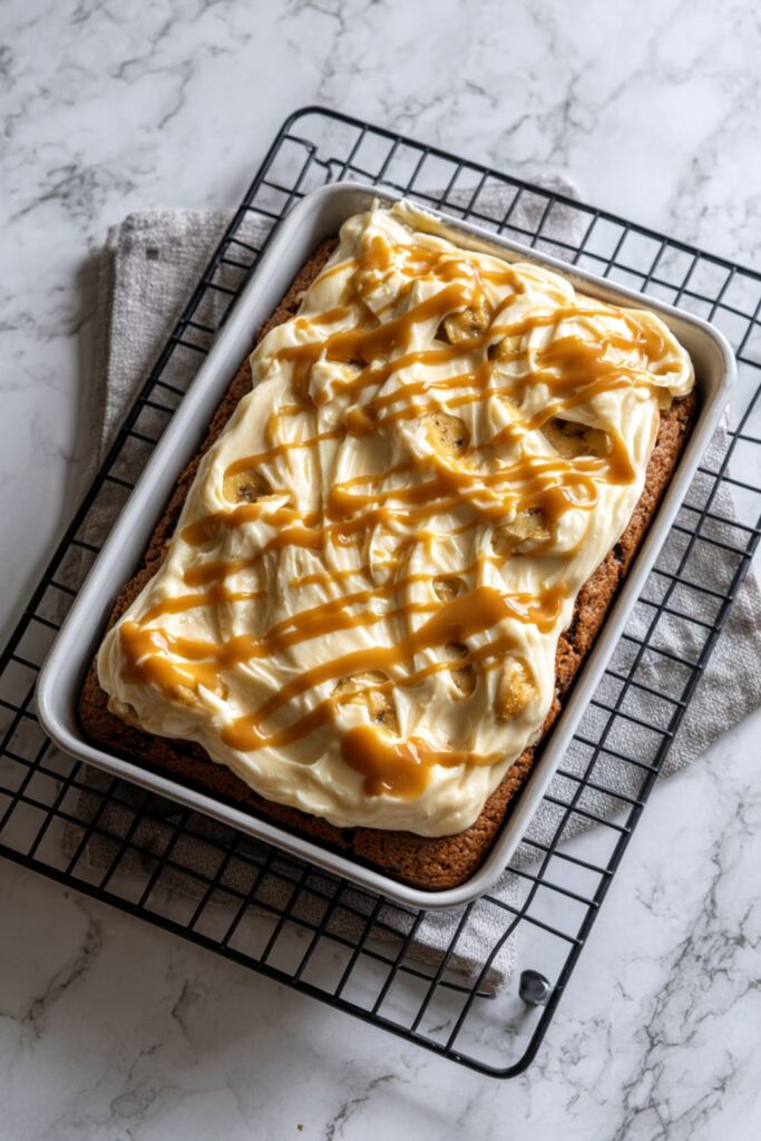 - Frost and drizzle: Spread the icing over the cooled cake, then drizzle with the reserved caramel. Slice and serve.