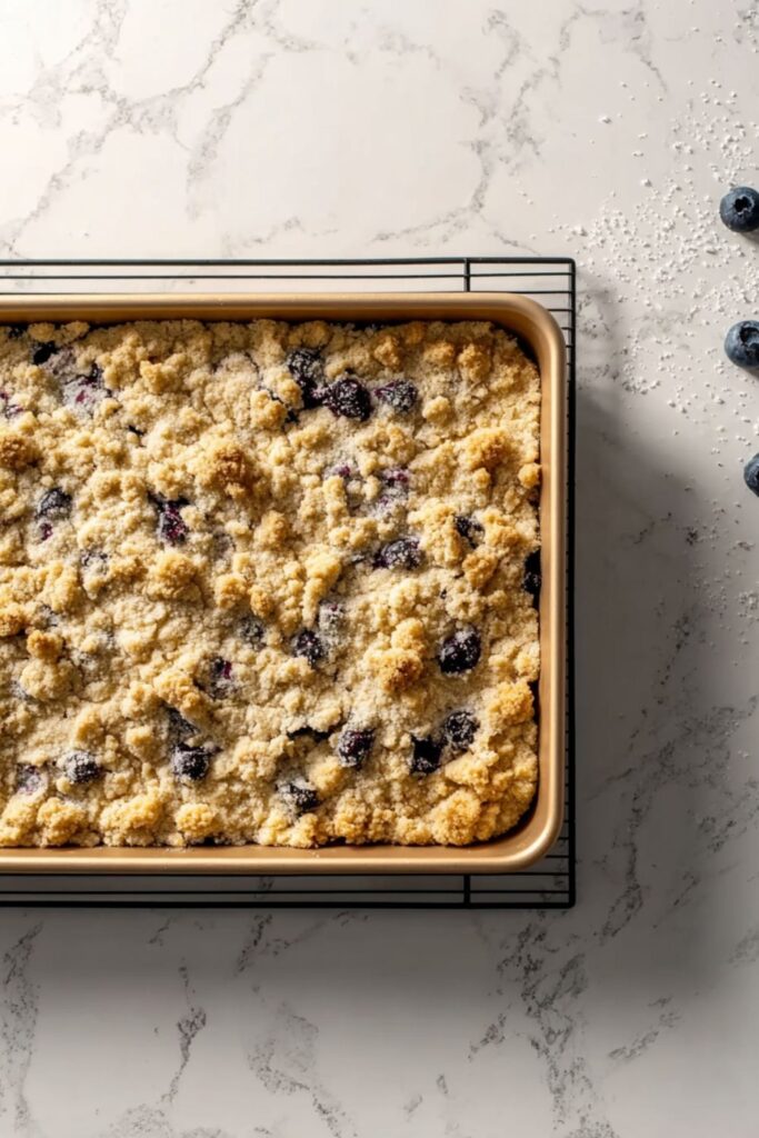 - Transfer to pan and add topping: Spoon the batter into the prepared baking pan. Toss the remaining 1 cup blueberries with the crumb topping and sprinkle it evenly over the batter.