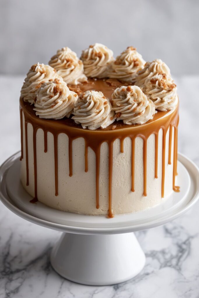 - Assemble the cake: Reserve 1 cup of frosting in a piping bag. Stack the cooled cake layers with ¾ cup of frosting between each. Frost the top and sides. Drizzle the remaining butterscotch sauce over the top, letting it drip down the sides. Pipe decorations with reserved frosting. Chill for 30 minutes to set.