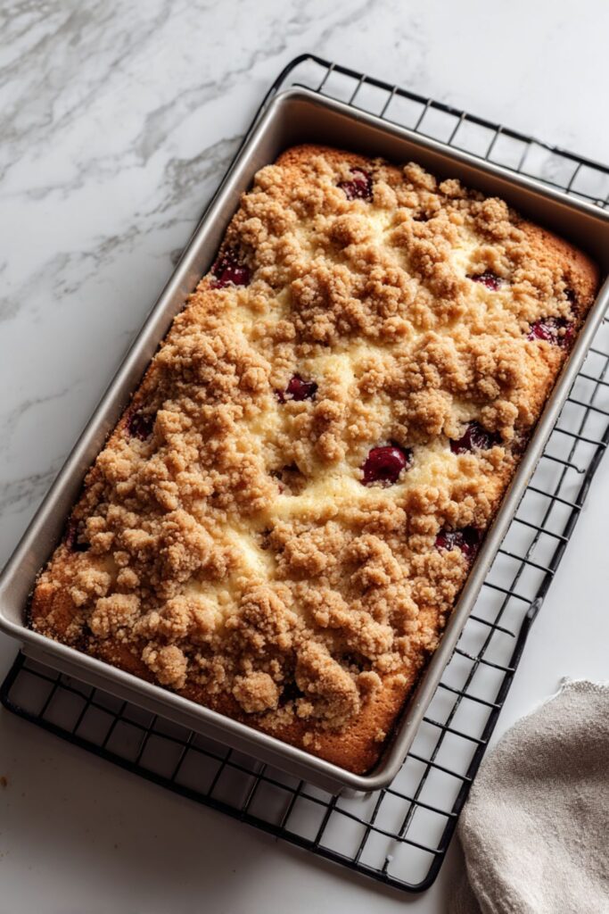 A tender cherry coffee cake topped with a buttery streusel crumb.