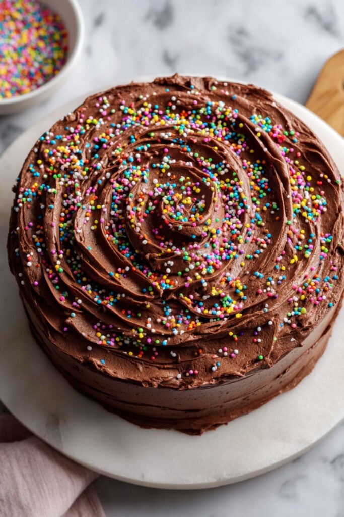 A moist chocolate layer cake with rich chocolate frosting and colorful sprinkles—perfect for birthdays.