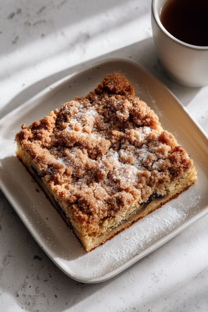 A soft, buttery cake topped with a thick cinnamon sugar crumb, perfect for breakfast or dessert.