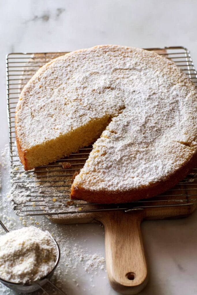 A moist and nutty lemon-almond cornmeal cake dusted with sugar for a rustic dessert.