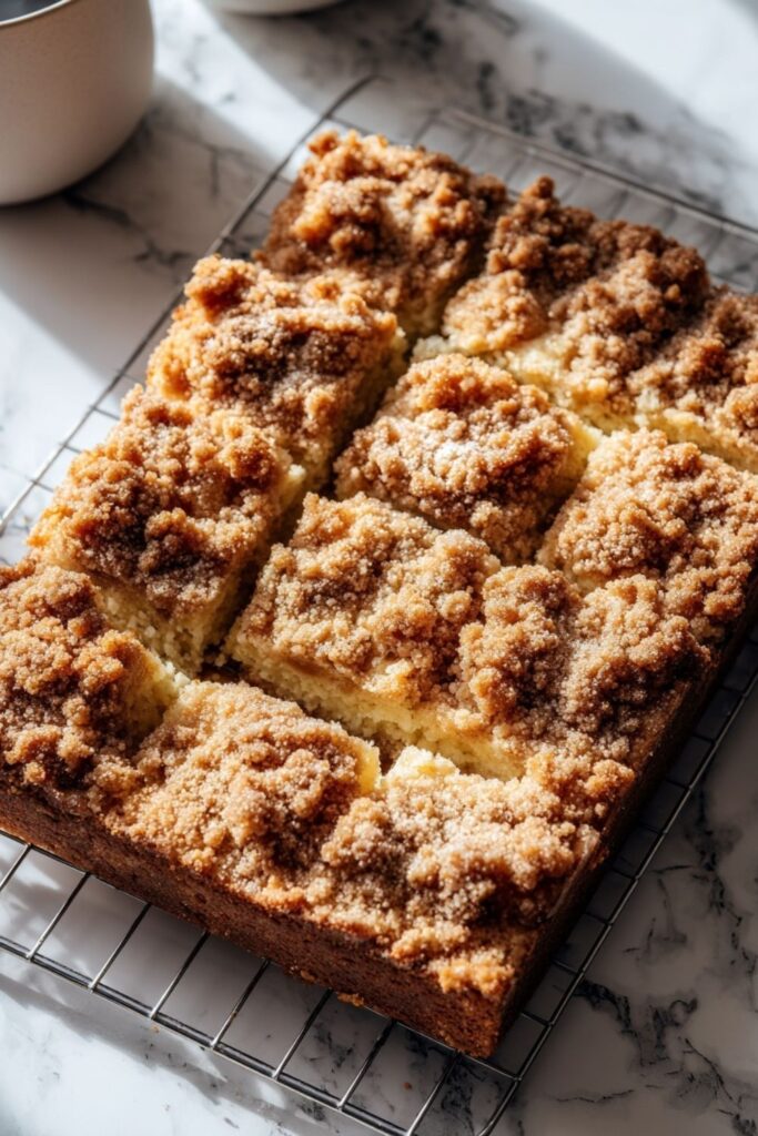 A soft vanilla cake topped with a buttery cinnamon crumb—perfect for breakfast or desserts.