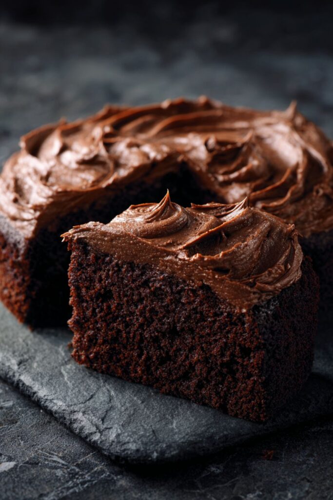 - Make and apply frosting: Mix hot water, butter, cocoa powder, icing sugar, and a pinch of salt until smooth. Frost the top of the cooled cake in a swirling pattern.