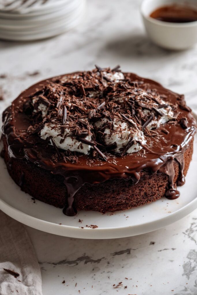 - Make the glaze and garnish: Place chopped chocolate in a bowl. Bring cream to a boil in a small saucepan, then pour over the chocolate. Whisk until smooth, let cool 2–3 minutes until thick yet pourable. Pour glaze over the cooled cake and spread to coat. Garnish with whipped cream and chocolate shavings if desired.