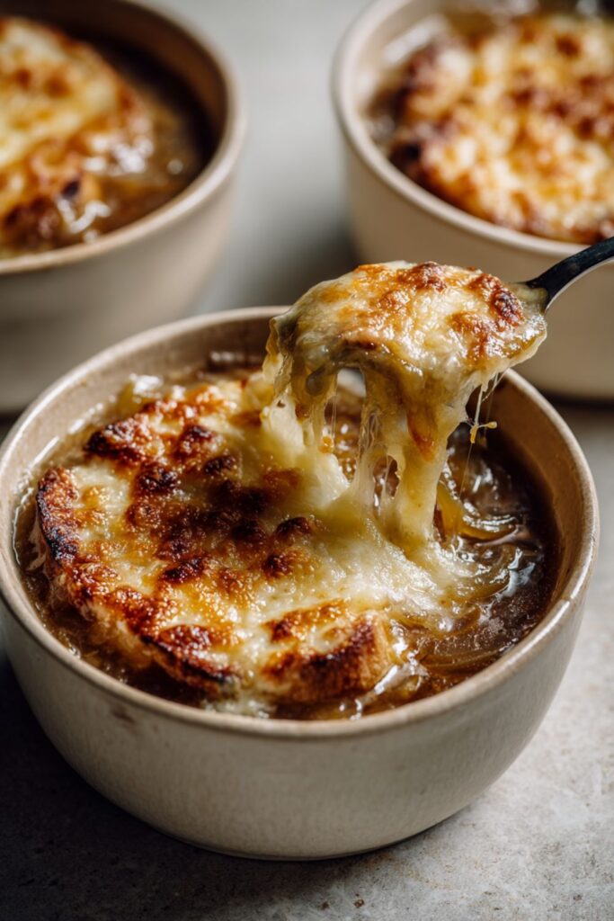 A deep, savory French onion soup topped with crusty bread and gooey melted cheese—just like your favorite bistro.