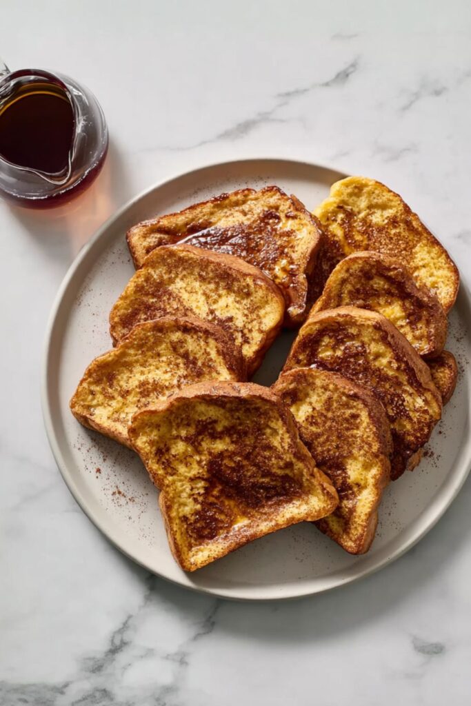 Thick slices of bread soaked in a spiced vanilla custard, then pan-fried to golden perfection—classic French toast made easy.