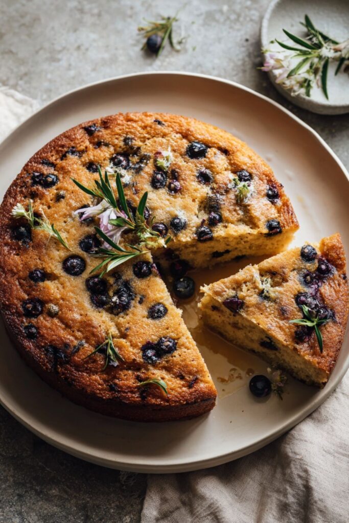 - Decorate and bake: Pour the batter into the prepared tin. Decorate the top with rosemary sprigs and edible flowers, pressing them in gently. Bake for 50-55 minutes, or until golden and a skewer inserted in the center comes out clean.