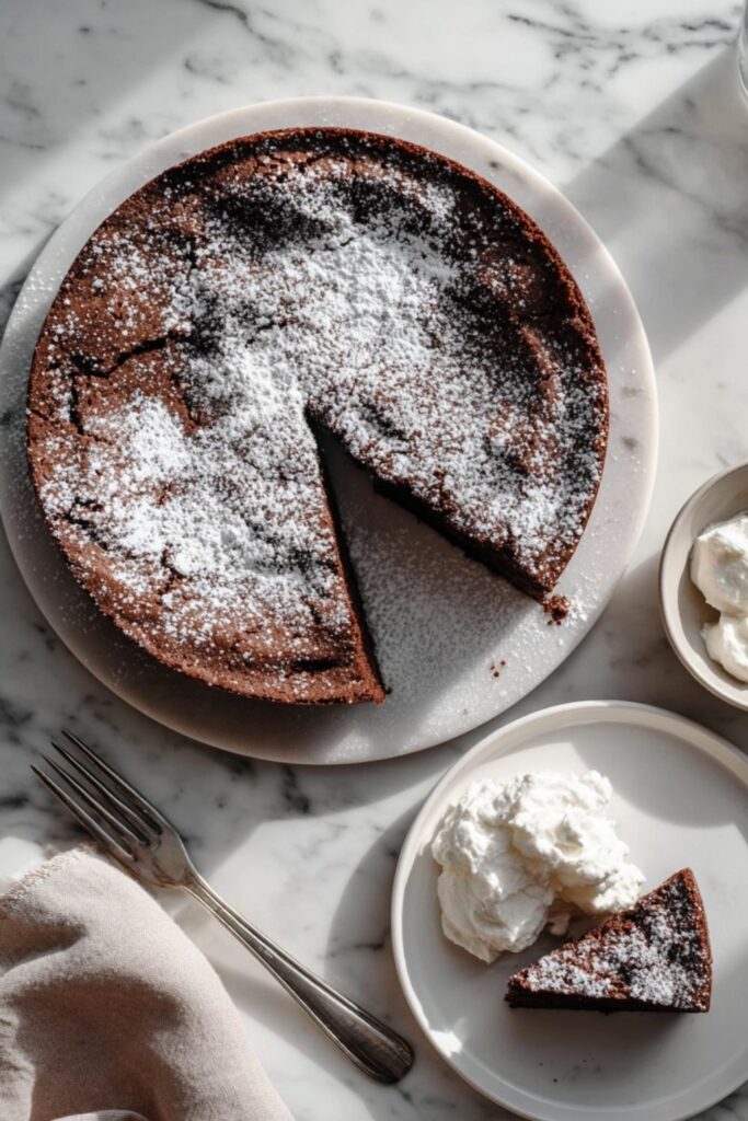 A rich, flourless chocolate cake that’s naturally gluten free, made with whipped egg whites and bittersweet chocolate.