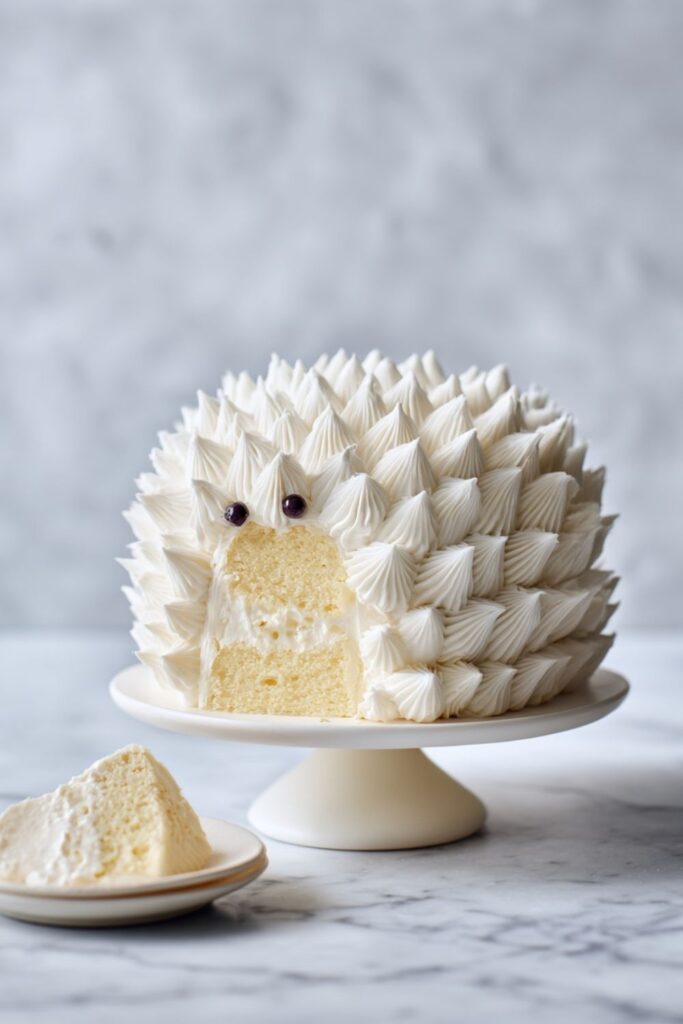 A delightful domed cake covered in buttercream and piped meringue “quills,” perfect for kids’ parties.