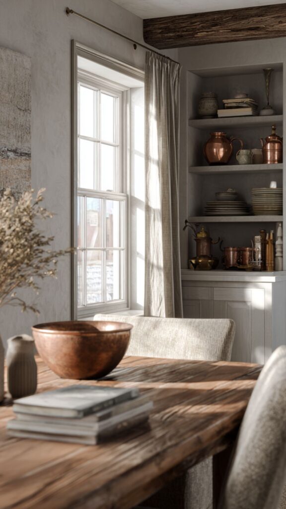 The neutral backdrop is not boring. It is the canvas that lets every object in the room speak. A copper pot against Bedford Gray walls glows. A jadeite bowl on a white marble counter becomes the only color the room needs.