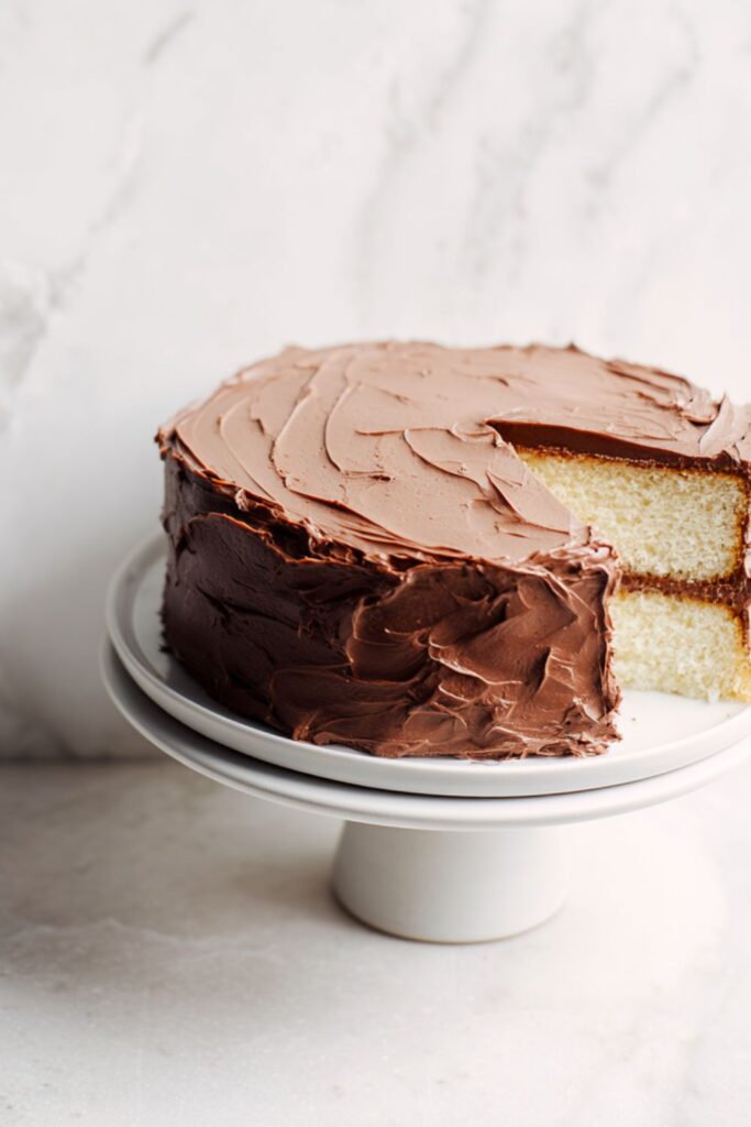 A moist and fluffy cake with warm milk and semisweet chocolate whipped frosting.