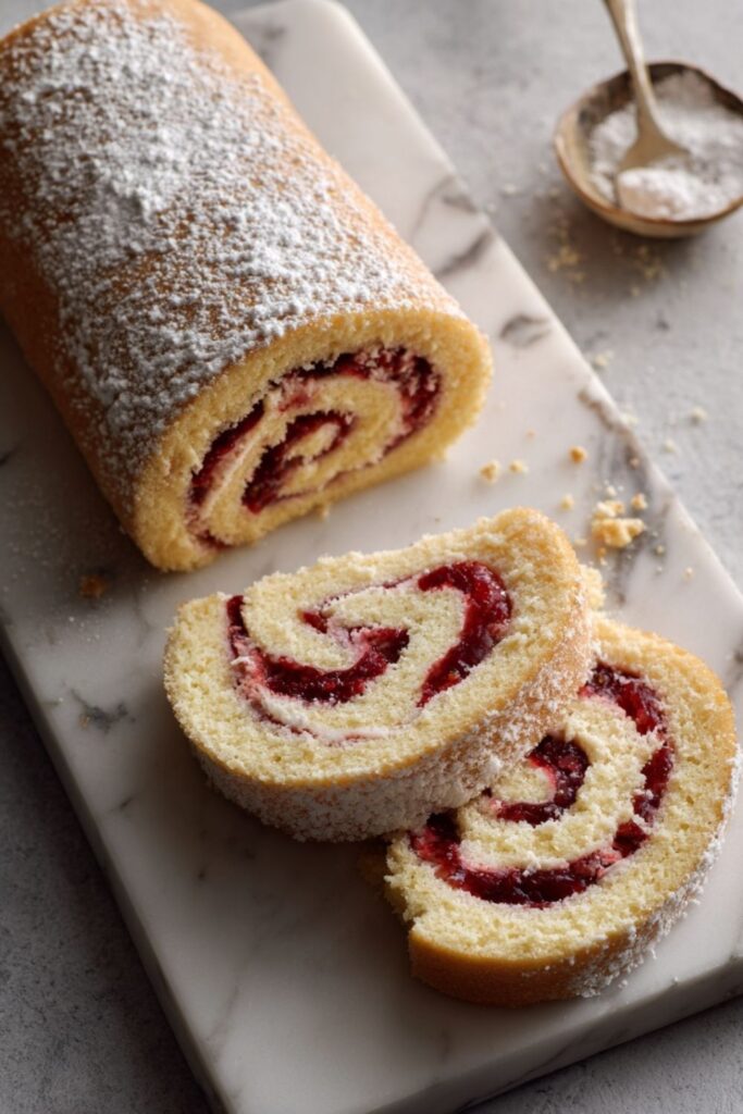 - Cool And Fill: Let the rolled cake cool completely on a wire rack. Once cool, carefully unroll it, spread the jam evenly (leaving a small border), and reroll the cake without the towel before dusting with more sugar to serve.