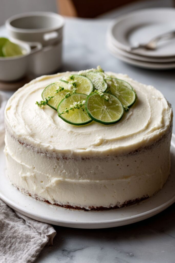 A tangy, moist lime cake topped with creamy lime-infused frosting, perfect for any occasion.