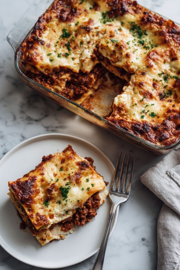 A hearty, classic lasagna layered with rich meat sauce, creamy ricotta, and melty mozzarella—perfect for family dinners or special occasions.