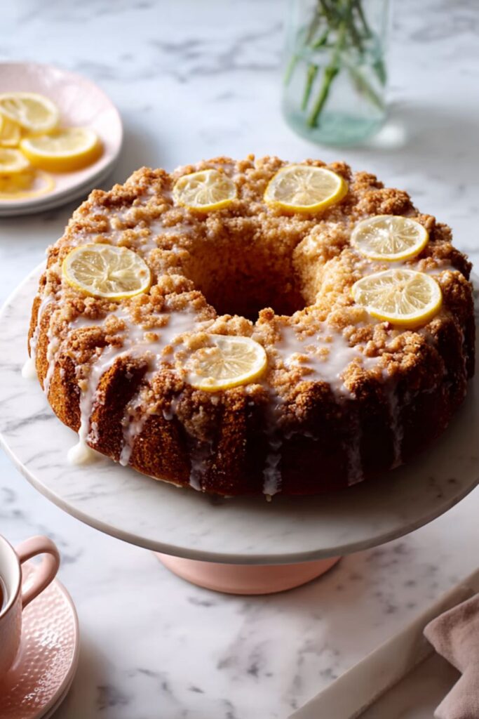 A tender, lemony coffee cake topped with buttery streusel and finished with a tangy glaze.