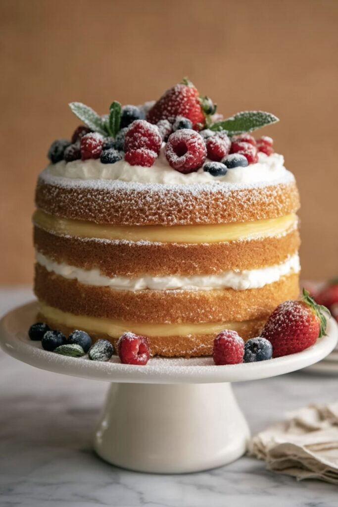 A soft, layered vanilla-lemon cake filled with lemon curd and topped with whipped cream and fresh berries.