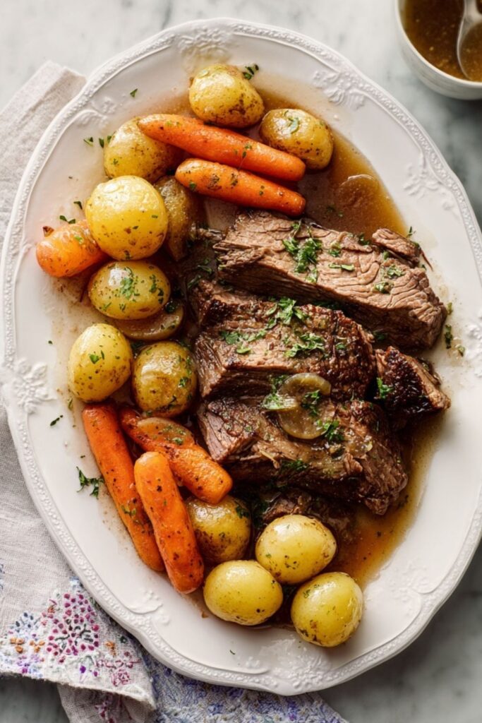 A slow-cooked beef chuck roast with tender carrots, potatoes, and a rich pan sauce—perfect for Sunday dinners or cozy gatherings.