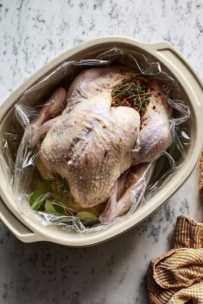 - Prepare container and turkey: Line a 5-gallon container with a large brining or oven-roasting bag. Place the turkey inside the bag.