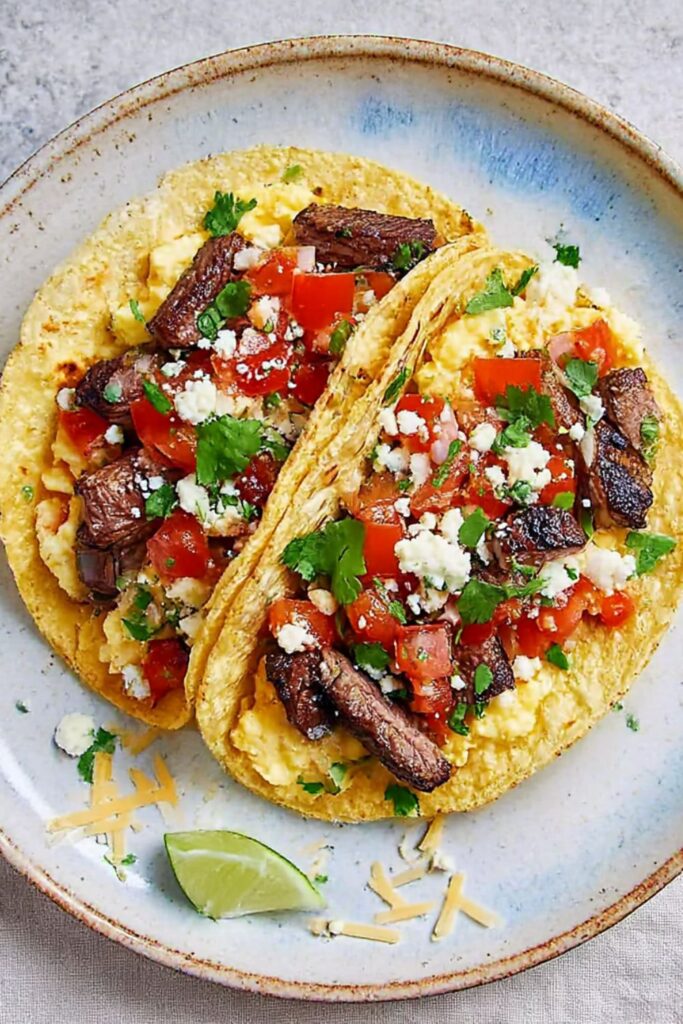 The ultimate breakfast taco or quick weeknight dinner, featuring juicy, chili-spiced skirt steak, fluffy scrambled eggs, and a fresh pico de gallo in warm corn tortillas.